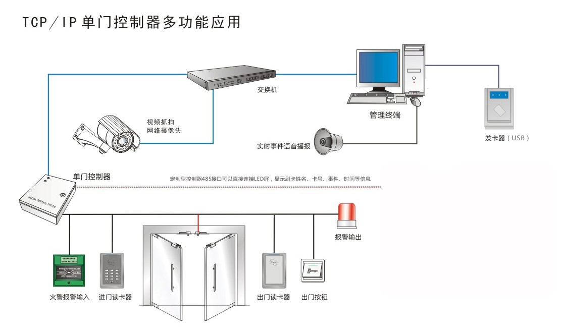 - 智能门禁终端将门禁控制器和门禁读卡器分离,安全性高(一体机容易在门外遭到破坏,安全性低),门禁控制器集成CPU、IO、存储、网络模块、内建操作系统,无需连接计算机进行通讯控制;