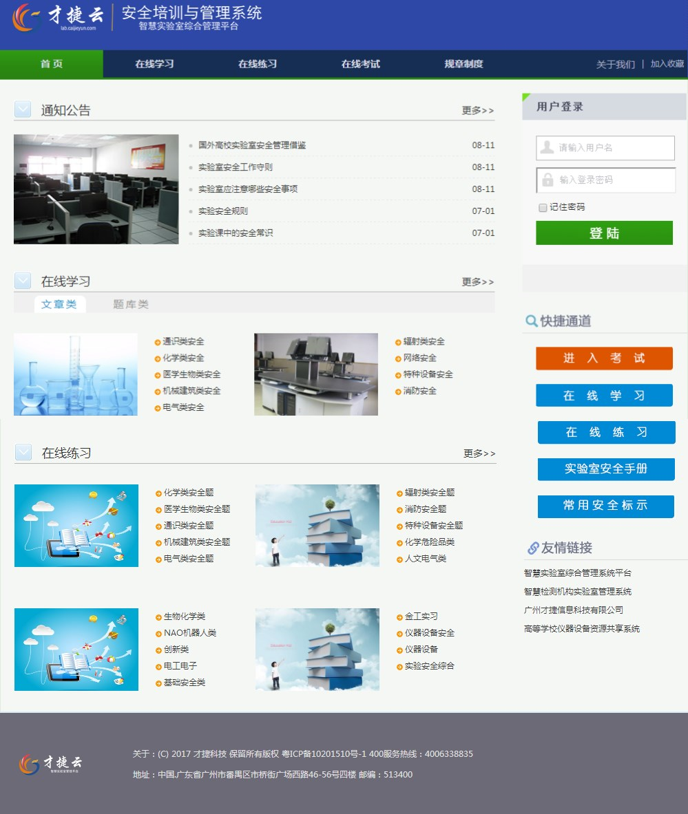 才捷智慧实验室安全准入管理系统包括在线学习、练习测试、考试三大功能模块及题库、信息公告等相关管理功能,共有安全通识、化学、生物医学、机械建筑、电气、辐射等六个大类安全题库,分为是非题和单选题两种题型。...