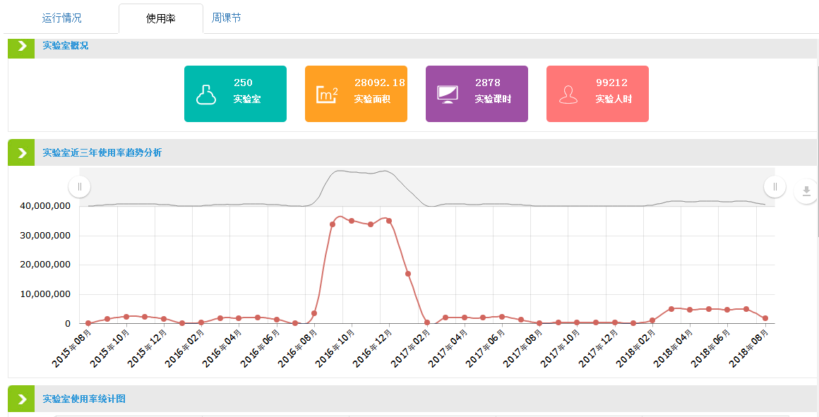 2)实验室使用情况:可图表显示当前在用的实验室数量、实验室名称和学院分布;可按照学院、学年统计参加实验室的人次数、实验室使用率,分析近三年实验室使用率变化趋势;可统计分析每个学院实验室周课时安排情况。